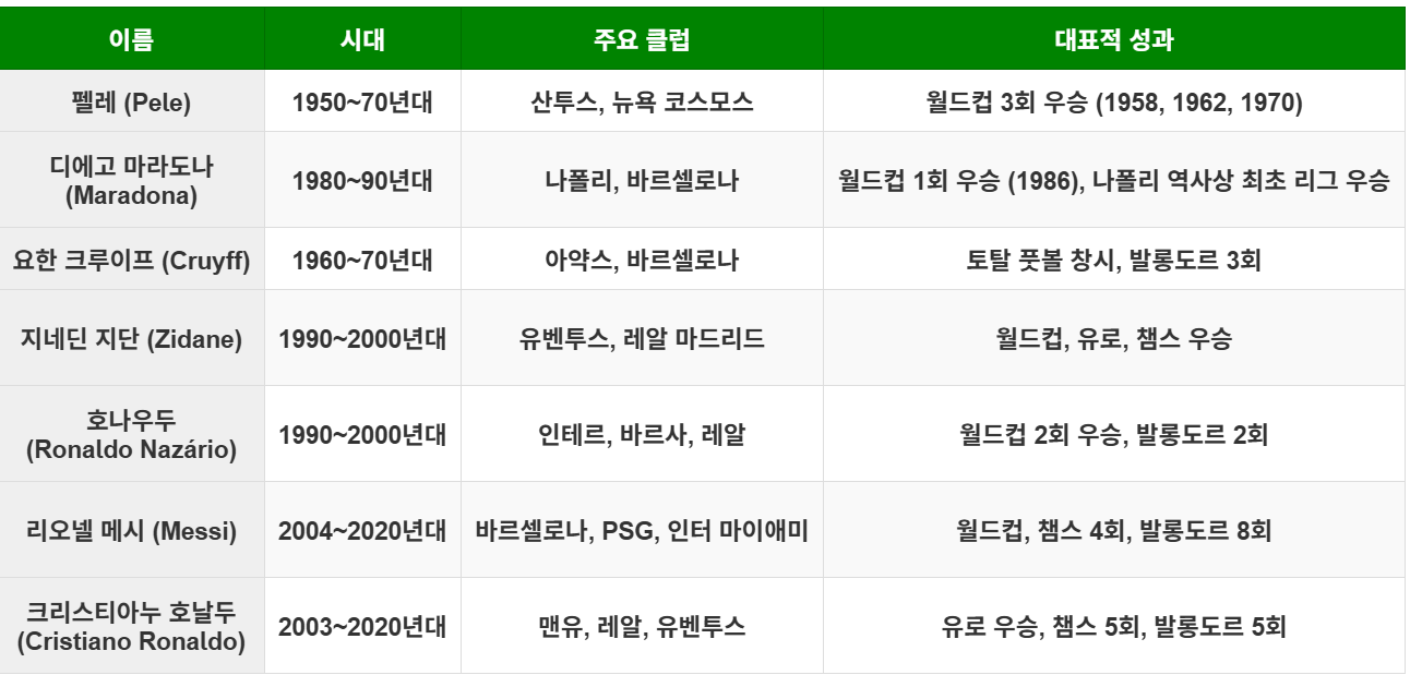 | 항목 | 펠레 | 마라도나 | 크루이프 | R9 호나우두 | 지단 | 호날두 | 메시 |