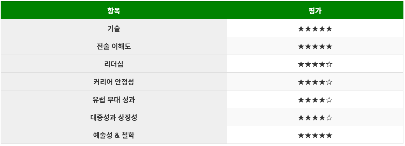 그의 스타일은 마치 클래식 음악과도 같아, 현대 축구의 빠르고 강력한 리듬 속에서도 여운을 남깁니다.