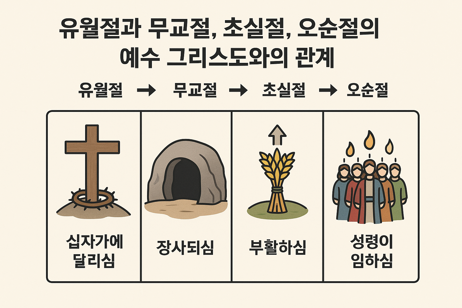 이스라엘의 절기들은 단지 농경사회의 감사제나 전통적인 의례가 아닙니다. 이 절기들은 하나님의 구속사 계획을 미리 보여주는 그림자요 모형(히 10:1)이었으며, 예수 그리스도 안에서 온전히 성취되었습니다. 특별히 유월절에서 시작하여 무교절, 초실절, 오순절로 이어지는 절기들은 예수님의 죽으심과 부활, 성령 강림, 교회 탄생까지 연결되는 매우 중요한 상징입니다.