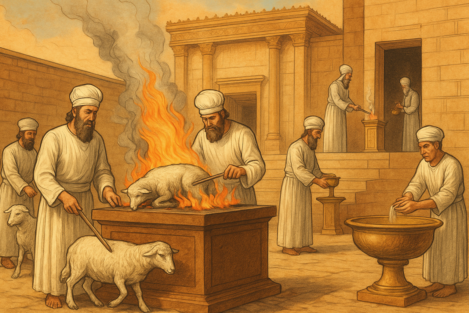 - 어린 양 도살 및 피 뿌림 – 제단의 네 뿔과 주변에 피를 뿌림.